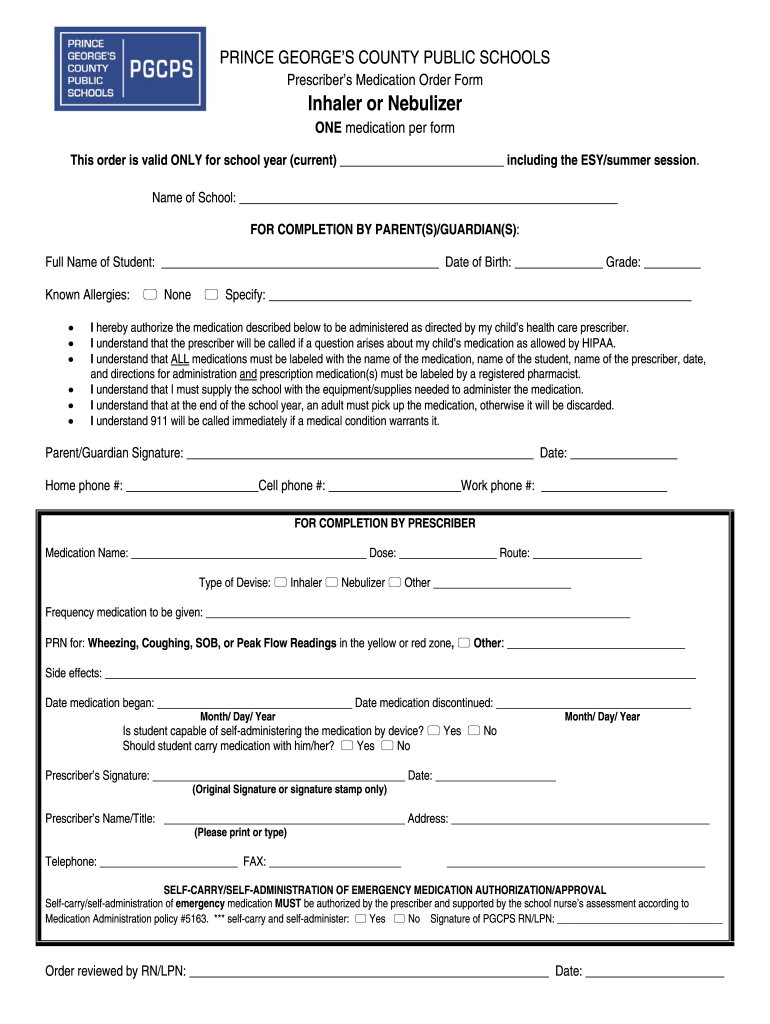 PRINCE GEORGES COUNTY PUBLIC SCHOOLS Prescribers Medication Order FormInhaler or Nebulizer ONE medication per from This order is valid ONLY for school year (current) including the ESY/summer session.
