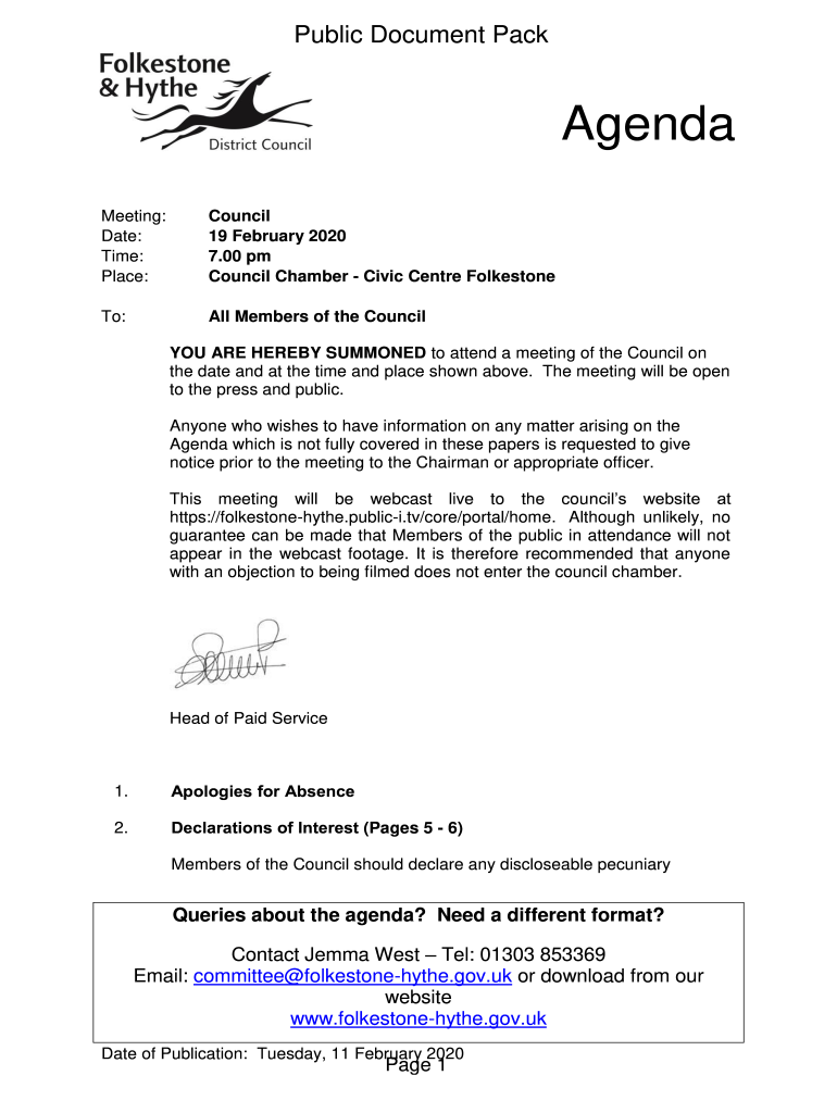 Public Document Packaged Meeting: Date: Time: Place:Council 19 February 2020 7.00 pm Council Chamber Civic Center Folkestone:All Members of the Council YOU ARE HEREBY SUMMONED to attend a meeting