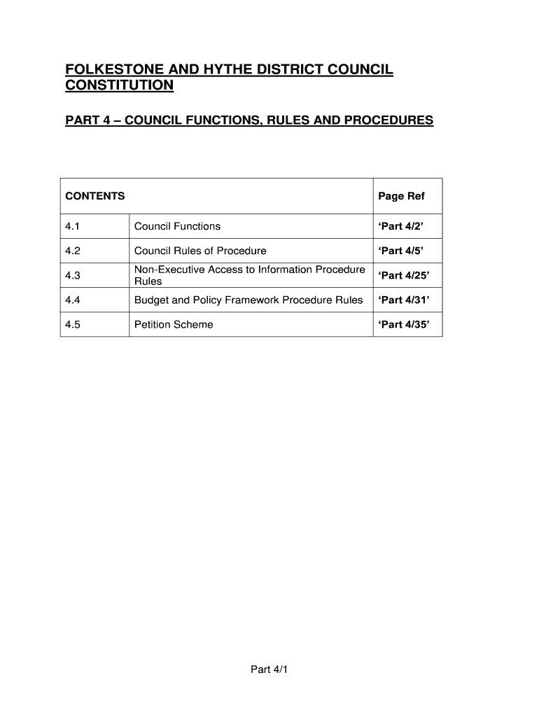 FOLKESTONE AND THE DISTRICT COUNCIL CONSTITUTION PART 4 COUNCIL FUNCTIONS, RULES AND PROCEDURESCONTENTSPage Ref4.1Council Functionary 4/24.2Council Rules of ProcedurePart 4/54.3NonExecutive Access