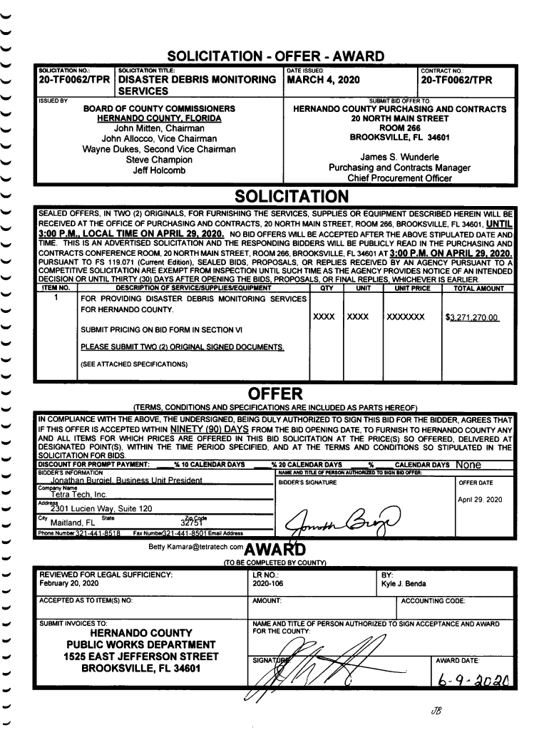 SOLICITATION OFFER AWARD SOLICITATION NO.:SOLICITATION TITLE:DATE ISSUEDCONTRACT NO.20TF0062fTPR DISASTER DEBRIS MONITORING MARCH 4, 2020, SERVICES ISSUED BY20TF0062fTPR SUBMIT BID OFFER BOARD OF