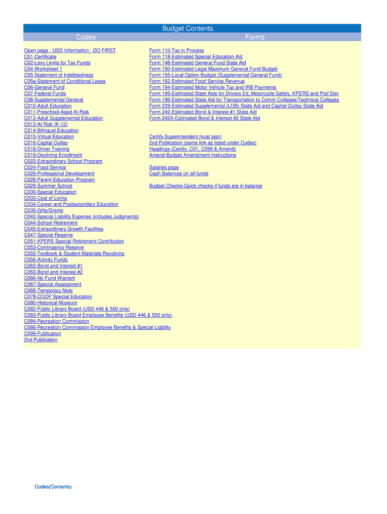 BUDGET CONTENTS FUNDS Budget ContentsCodesFormsOpen page USD Information DO FIRST Form 110Tax in Process C01Certificate Form 118Estimated Special Education Aid C02Levy Limits for Tax Funds Form 148Estimated