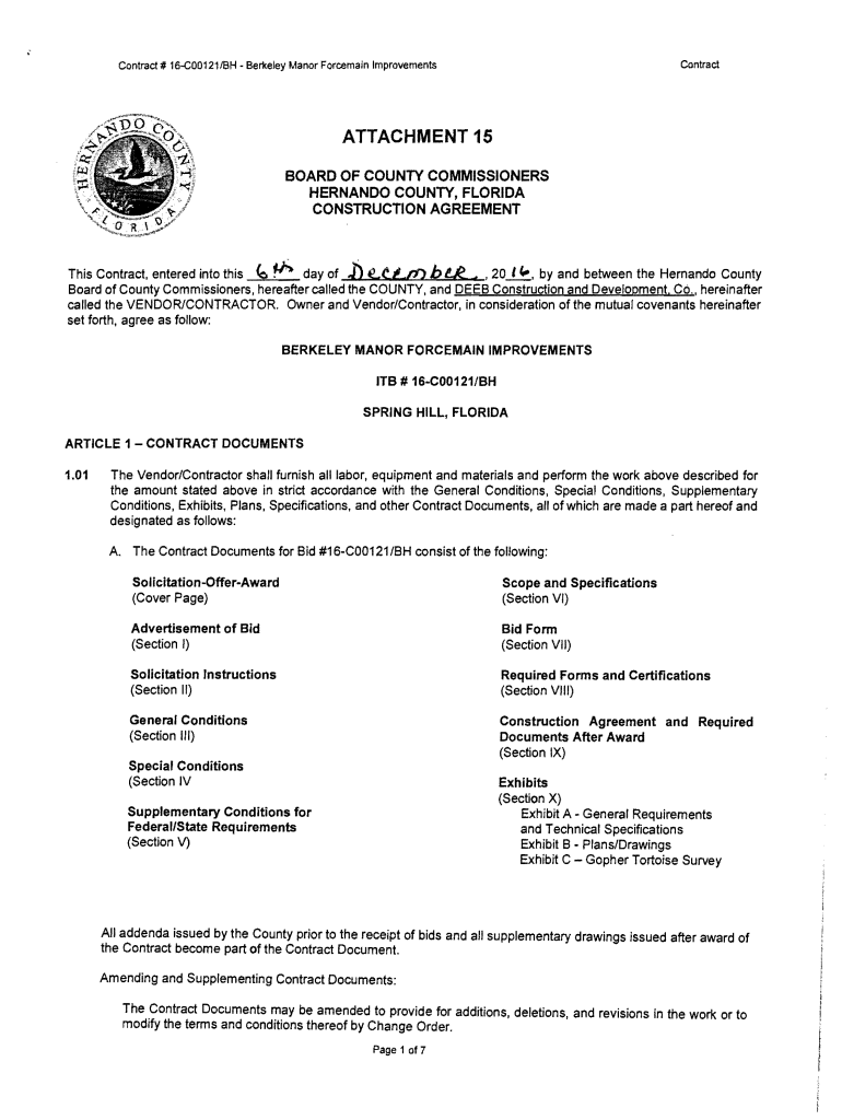 ContractContract # 16C001211BH Berkeley Manor Force main ImprovementsATTACHMENT 15 BOARD OF COUNTY COMMISSIONERS HERNANDO COUNTY, FLORIDA CONSTRUCTION Agreements Contract, entered into this LC. day