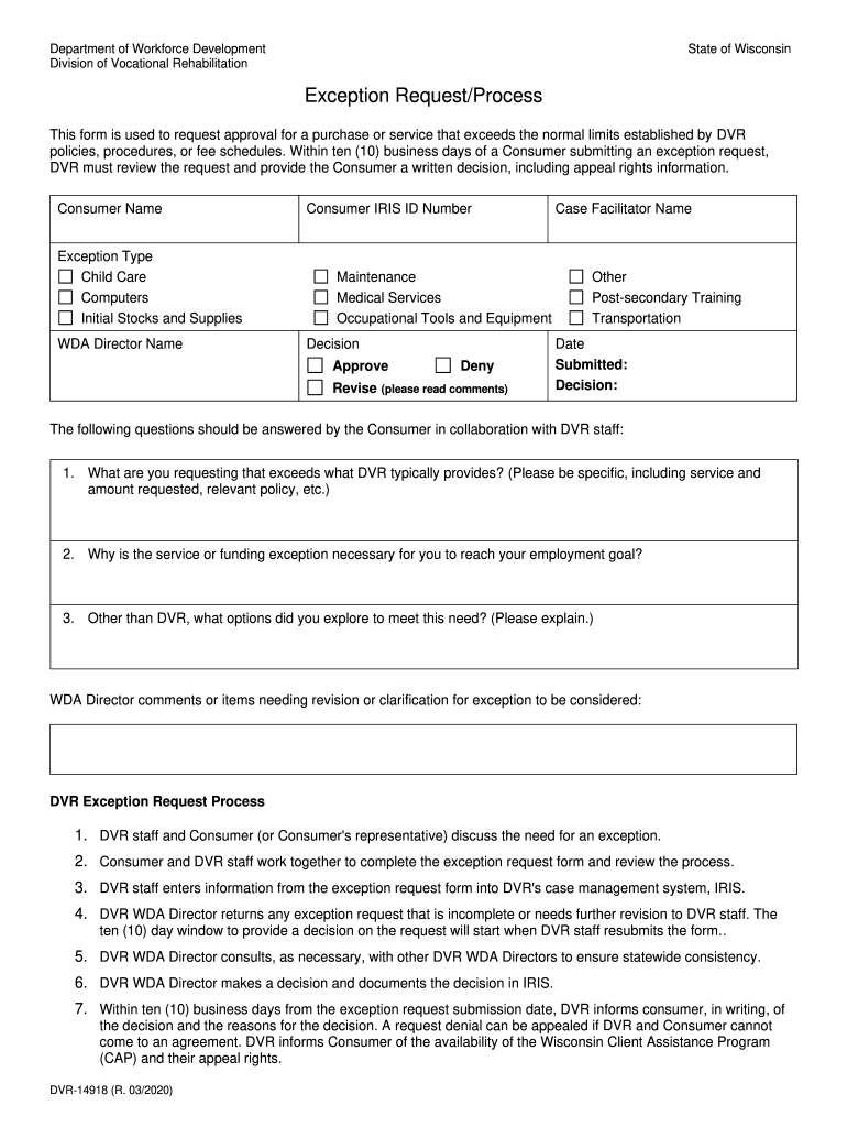 Division of Vocational RehabilitationState of WisconsinException Request/Process