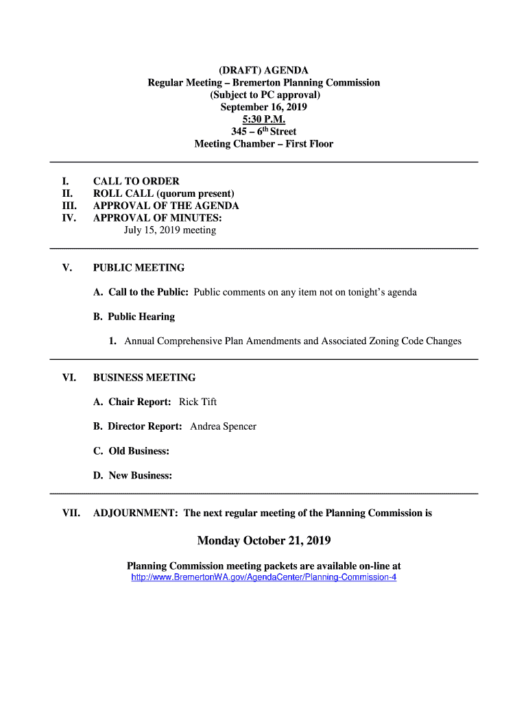 (DRAFT) AGENDA Regular Meeting Bremerton Planning Commission (Subject to PC approval) September 16, 2019 5:30 P.M. 345 6th Street Meeting Chamber First Floor. II. III. IV.CALL TO ORDER ROLL CALL (quorum