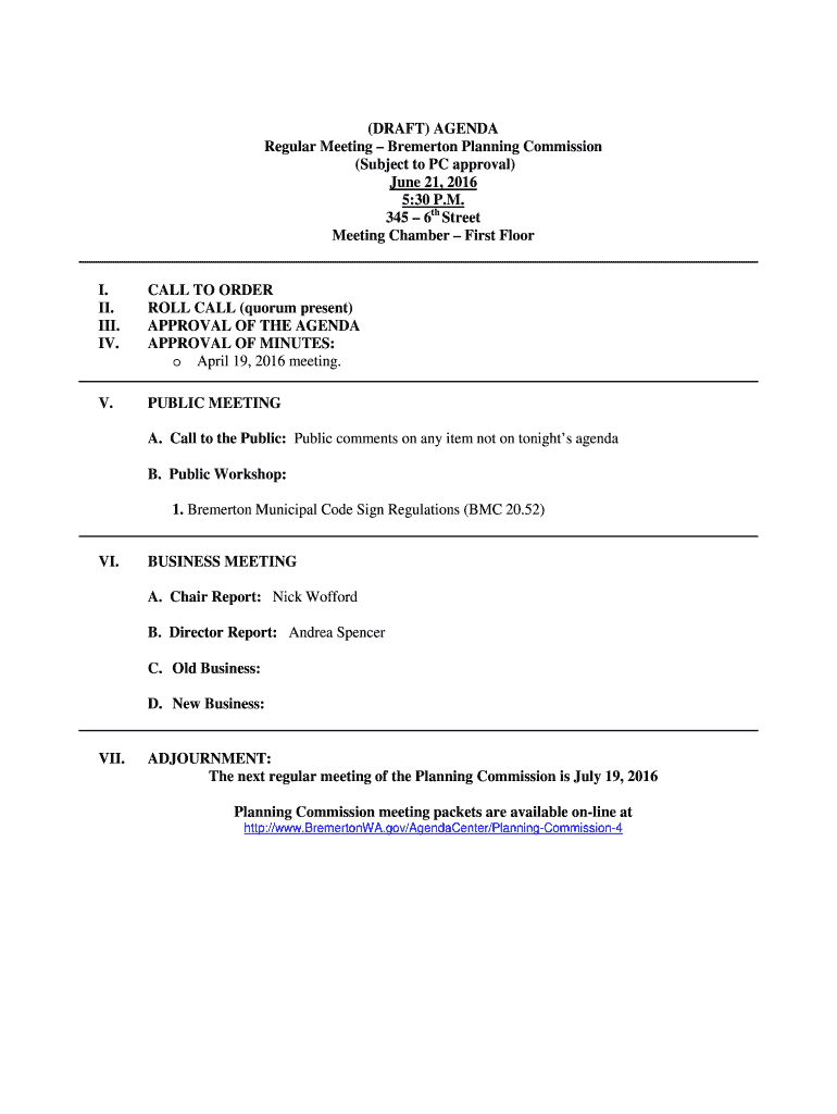 (DRAFT) AGENDA Regular Meeting Bremerton Planning Commission (Subject to PC approval) June 21, 2016 5:30 P.M. 345 6th Street Meeting Chamber First Floor. II. III. IV.CALL TO ORDER ROLL CALL (quorum