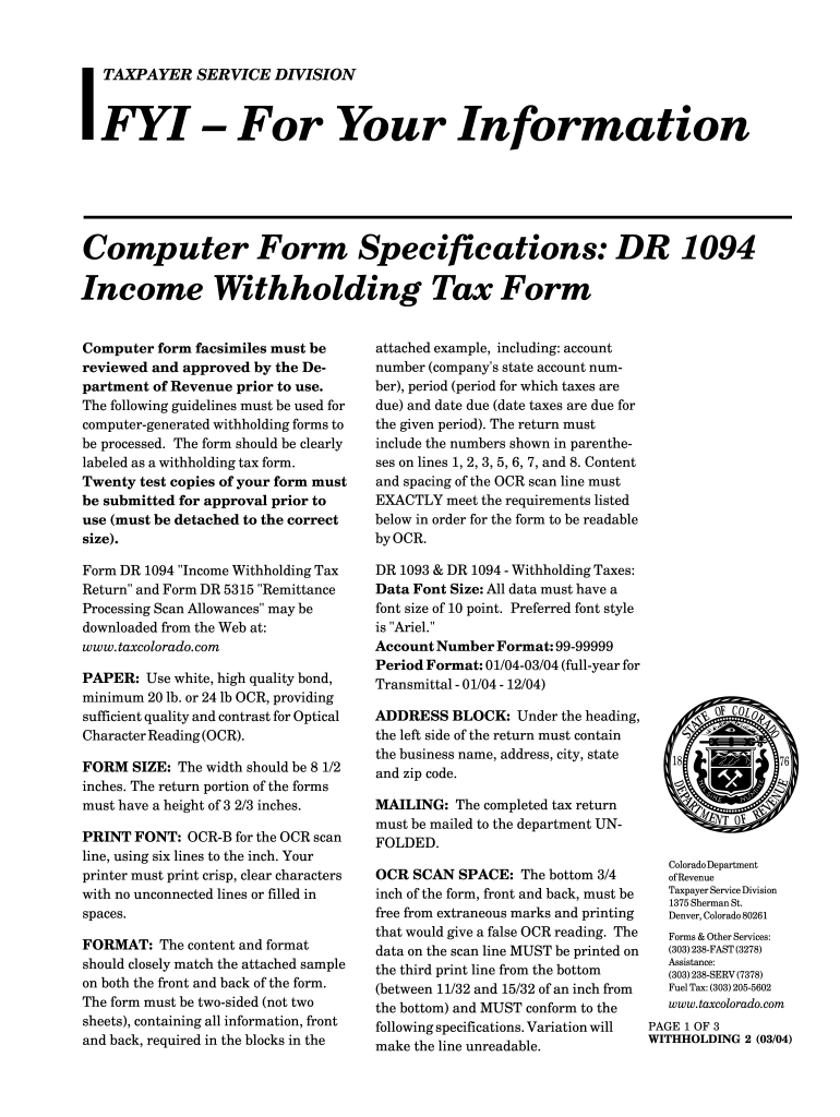 TAXPAYER SERVICE DIVISION FYI For Your Information Computer Form Specifications: DR 1094 Income Withholding Tax Form Computer form facsimiles must be reviewed and approved by the Department of Revenue