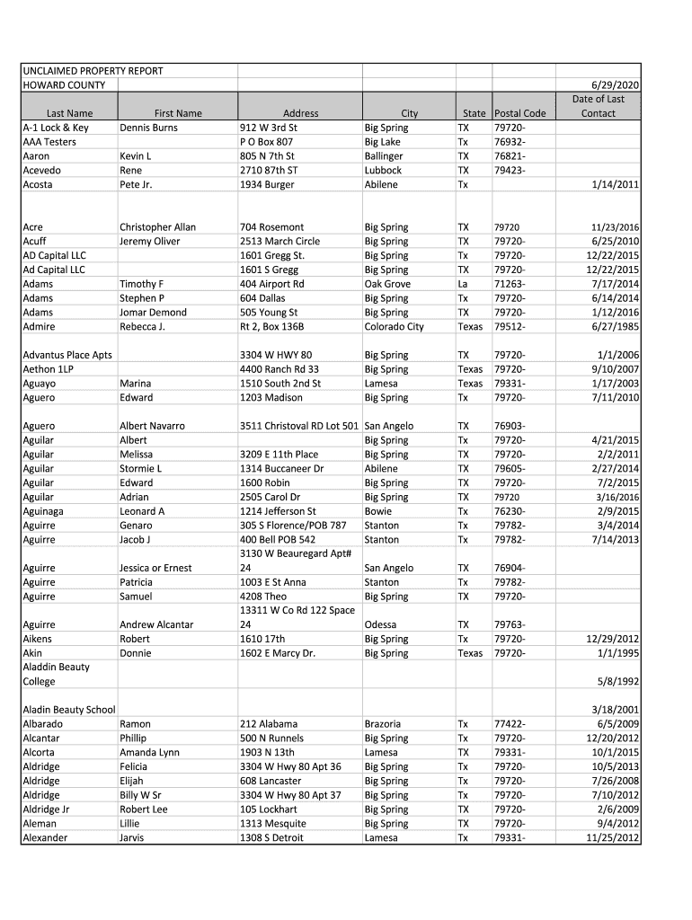 UNCLAIMED PROPERTY REPORT HOWARD COUNTY Last Name A1 Lock & Key AAA Testers Aaron Acevedo AcostaFirst Name Dennis Furnace Acuff AD Capital LLC Ad Capital LLC Adams Adams Adams Admire Christopher Allan
