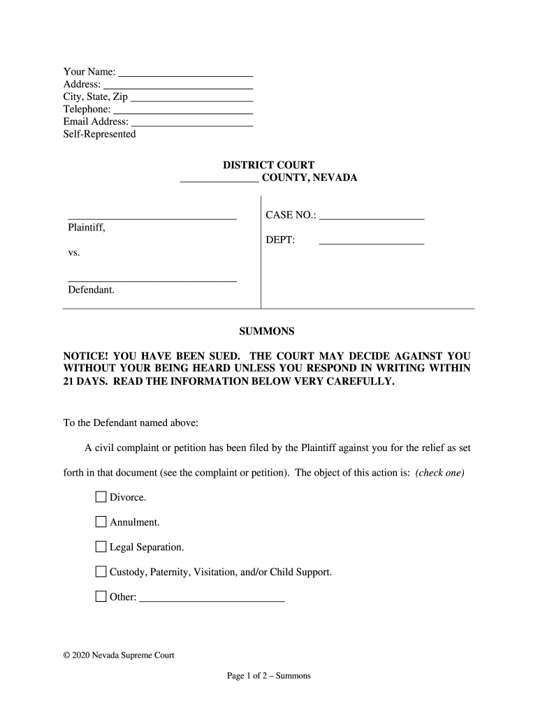 Your Name: Address: City, State, Zip Telephone: Email Address: SelfRepresented DISTRICT COURT COUNTY, NEVADA Plaintiff, CASE NO.: DEPT: vs. Defendant. SUMMONS NOTICE! YOU HAVE BEEN SUED. THE COURT