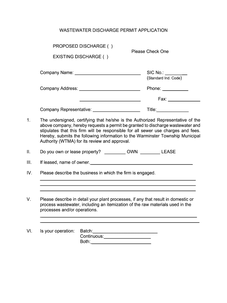 WASTEWATER DISCHARGE PERMIT APPLICATION PROPOSED DISCHARGE () Please Check One EXISTING DISCHARGE () Company Name:SIC No.: (Standard Ind. Code)Company Address:Phone: Fax: Company Representative:Title: