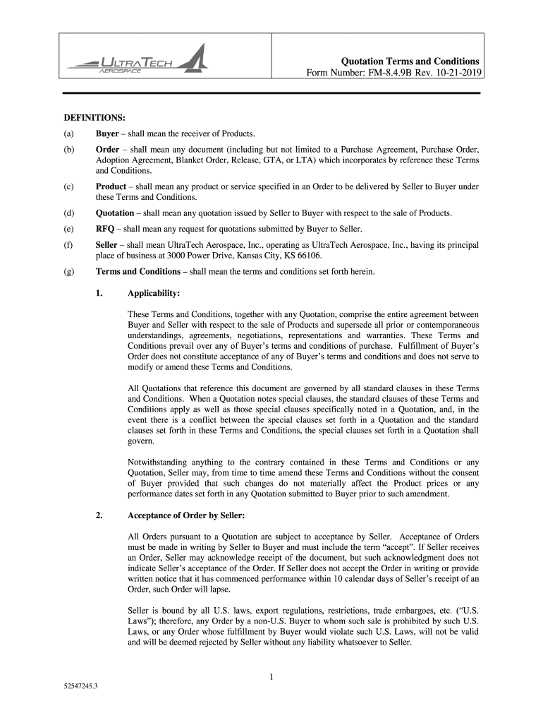 Quotation Terms and Conditions Form Number: FM8.4.9B Rev. 10212019DEFINITIONS: (a)Buyer shall mean the receiver of Products.(b)Order shall mean any document (including but not limited to a Purchase