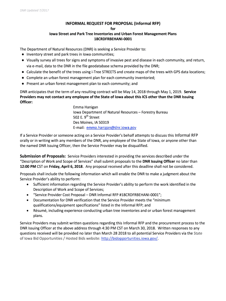 DNR Updated 7/2017INFORMAL REQUEST FOR PROPOSAL (Informal RFP) for Iowa Street and Park Tree Inventories and Urban Forest Management Plans 18CRDFRBEHANI0001 The Department of Natural Resources (DNR)