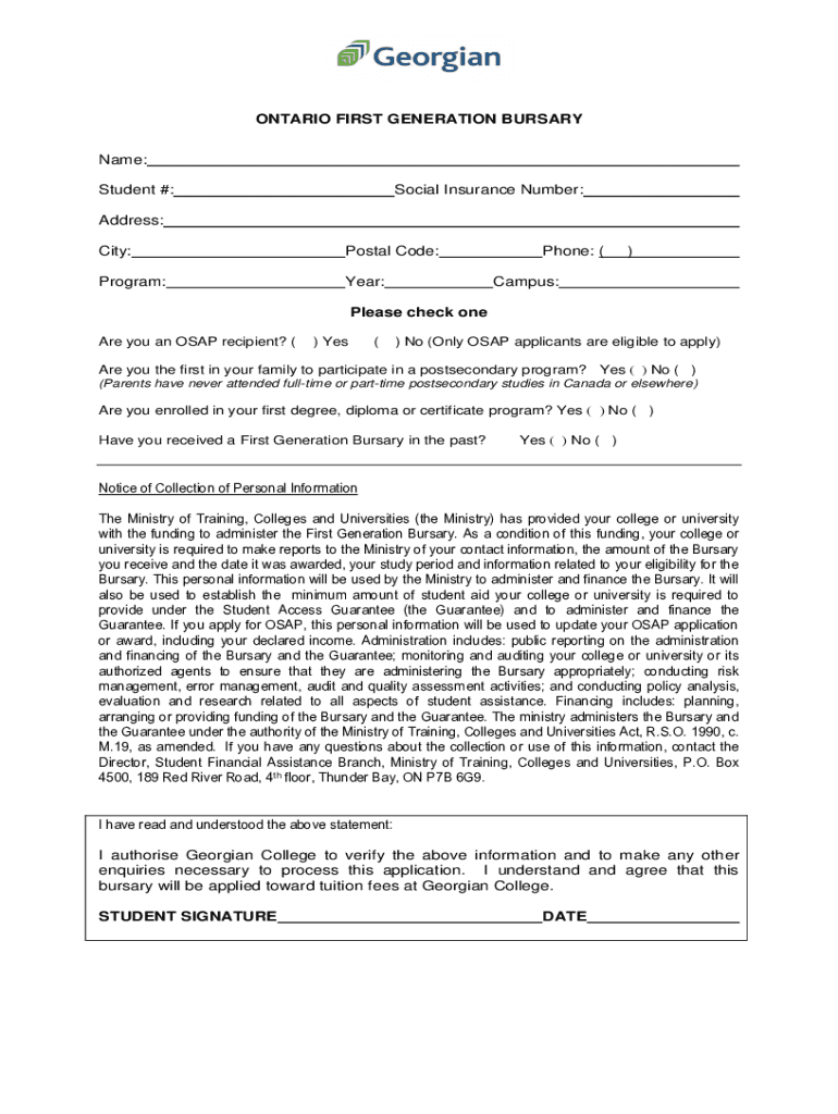 The Ontario First Generation Bursary Application is a scholarship application form used by students in Ontario to secure financial aid for postsecondary education.