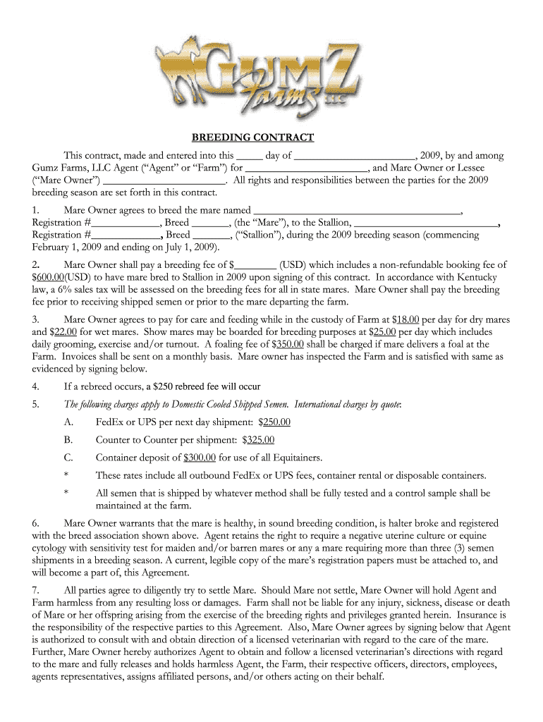 BREEDING CONTRACT This contract, made and entered into this day of, 2009, by and among Gum Farms, LLC Agent (Agent or Farm) for, and Mare Owner or Lessee (Mare Owner). All rights and responsibilities