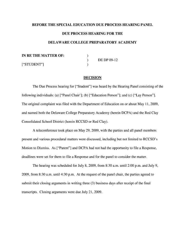 BEFORE THE SPECIAL EDUCATION DUE PROCESS HEARING PANEL DUE PROCESS HEARING FOR THE DELAWARE COLLEGE PREPARATORY ACADEMY IN RE THE MATTER OF: STUDENT)))DE DP 0912DECISION The Due Process hearing for