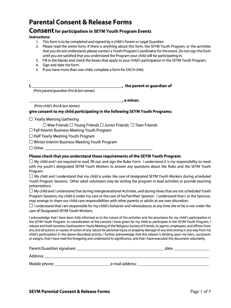 Parental Consent & Release Forms Consent for participation in SEEM Youth Program Events Instructions: 1. This form is to be completed and signed by a children Parent or Legal Guardian. 2. Please read