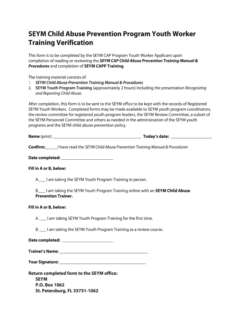 Get the free SEYM CAP Program Youth Worker Training Verification