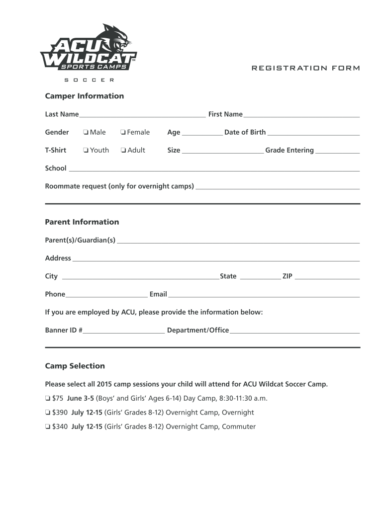 REGISTRATION FORM Camper Information Last Name First Name Gender Male Females Date of Birth Thirty Youth Adulterize Grade Entering School Roommate request (only for overnight camps) Parent Information