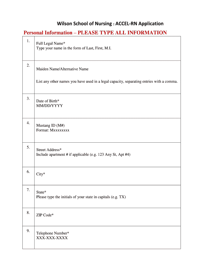 Wilson School of Nursing : ACCELA Application Personal Information PLEASE TYPE ALL INFORMATION 1. Full Legal Name* Type your name in the form of Last, First, M.I.2. Maiden Name/Alternative Name List