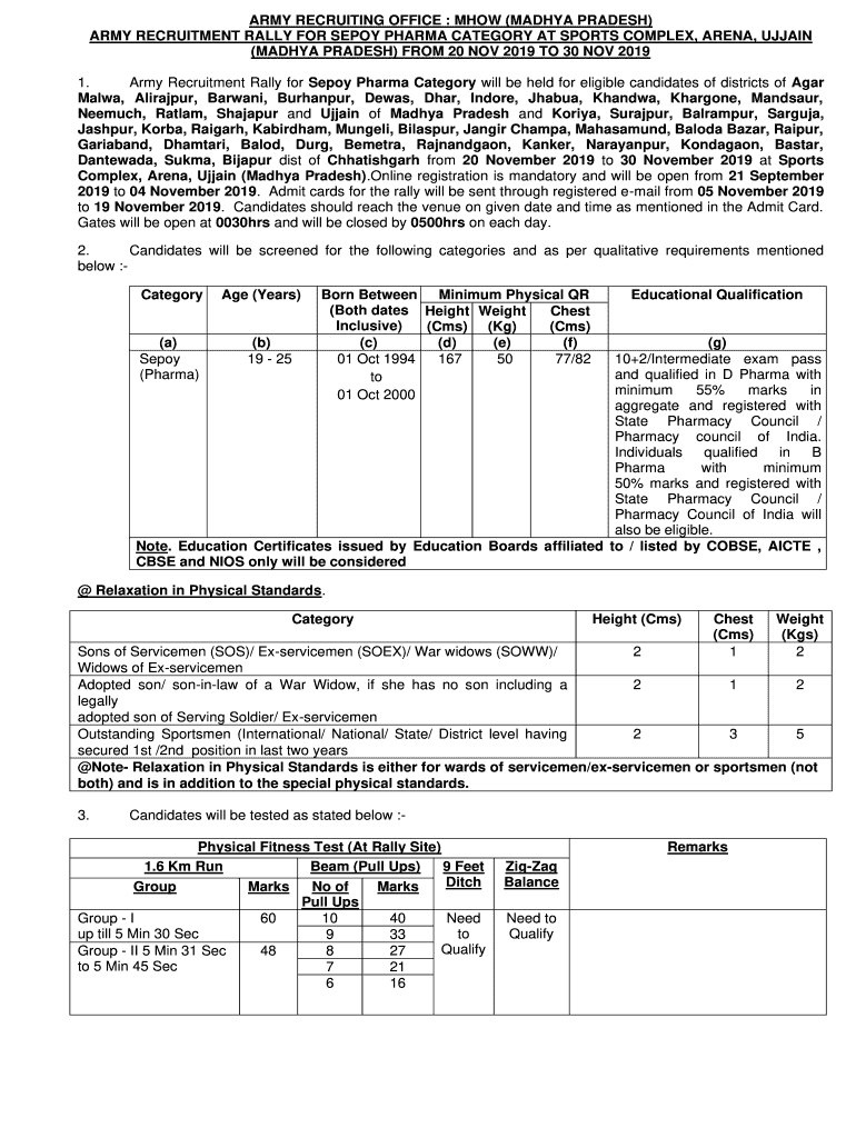 ARMY RECRUITMENT RALLY FOR SEPOY PHARMA CATEGORY AT SPORTS COMPLEX, ARENA, UJJAIN