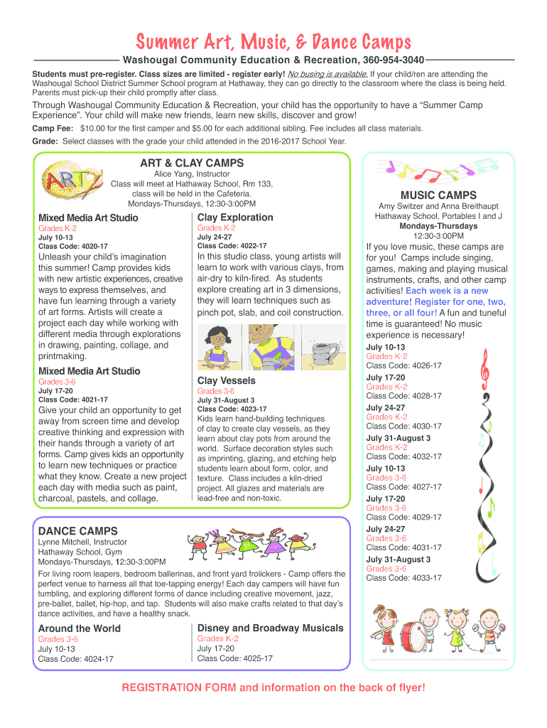 Summer Art, Music, & Dance CampsWashougal Community Education & Recreation, 3609543040Students must preregister. Class sizes are limited register early! No busing is available. If your child/men are