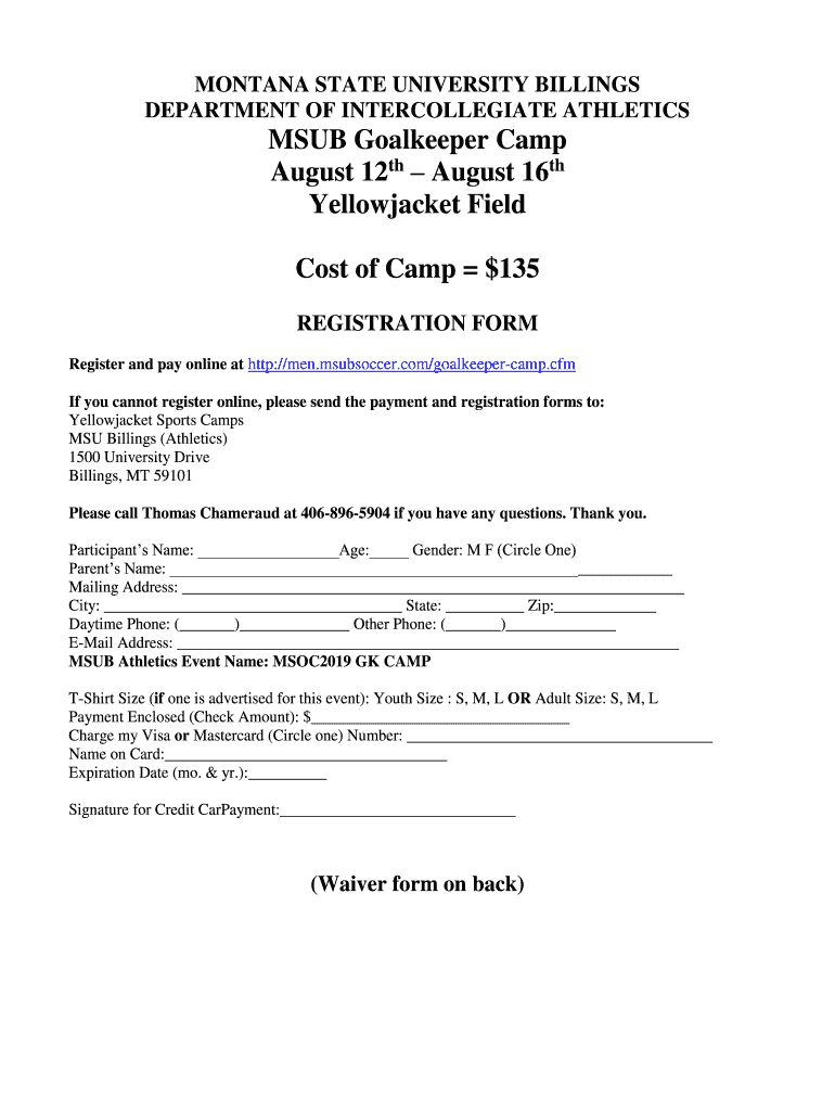 MONTANA STATE UNIVERSITY BILLINGS DEPARTMENT OF INTERCOLLEGIATE ATHLETICSMSUB Goalkeeper Camp August 12th August 16th Yellow jacket Field Cost of Camp $135 REGISTRATION FORM Register and pay online