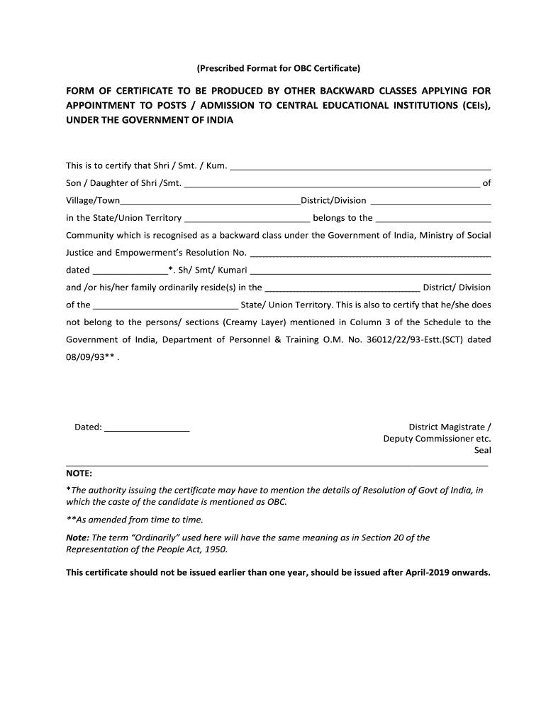 The prescribed format for OBC is required by individuals who belong to the Other Backward Classes (OBC) and need to apply for various caste-based benefits, reservations, or quotas provided by the government or educational institutions.