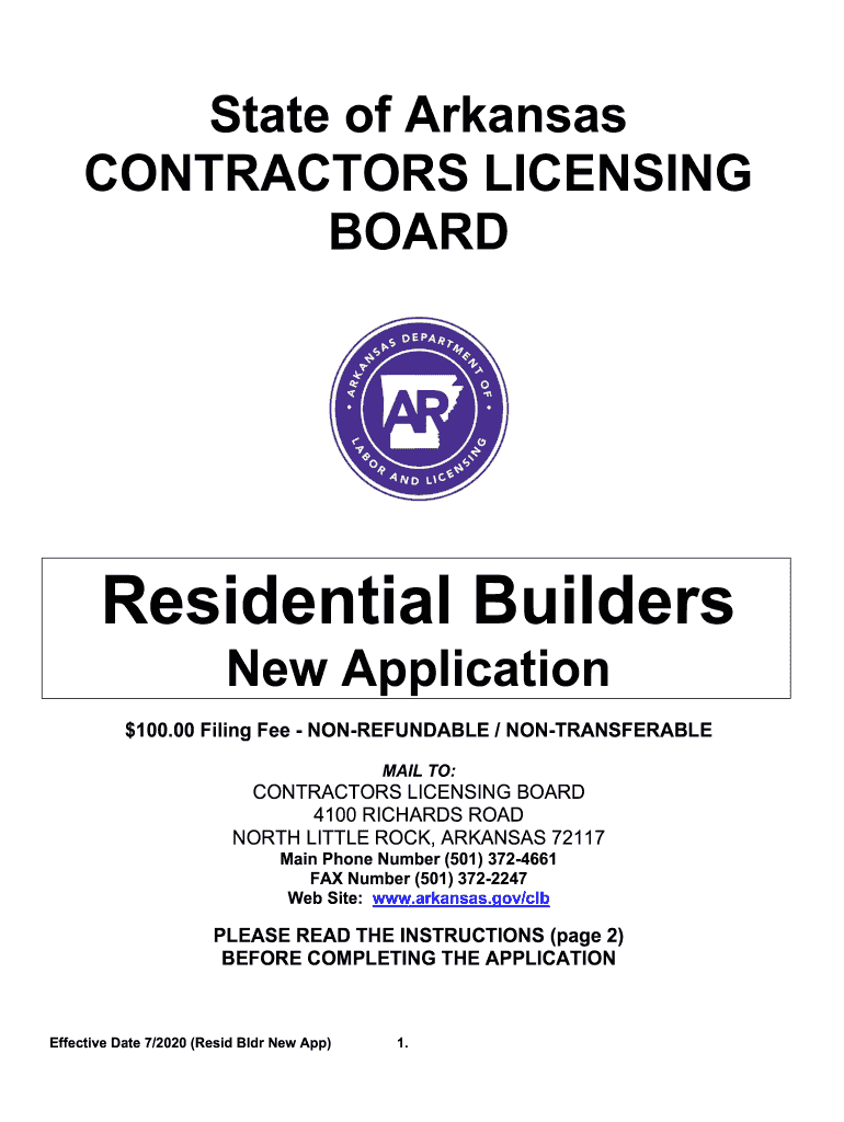 State of Arkansas CONTRACTORS LICENSING BOARDResidential Builders New Application $100.00 Filing Fee NONREFUNDABLE / NONTRANSFERABLE MAIL TO:CONTRACTORS LICENSING BOARD 4100 RICHARDS ROAD NORTH LITTLE