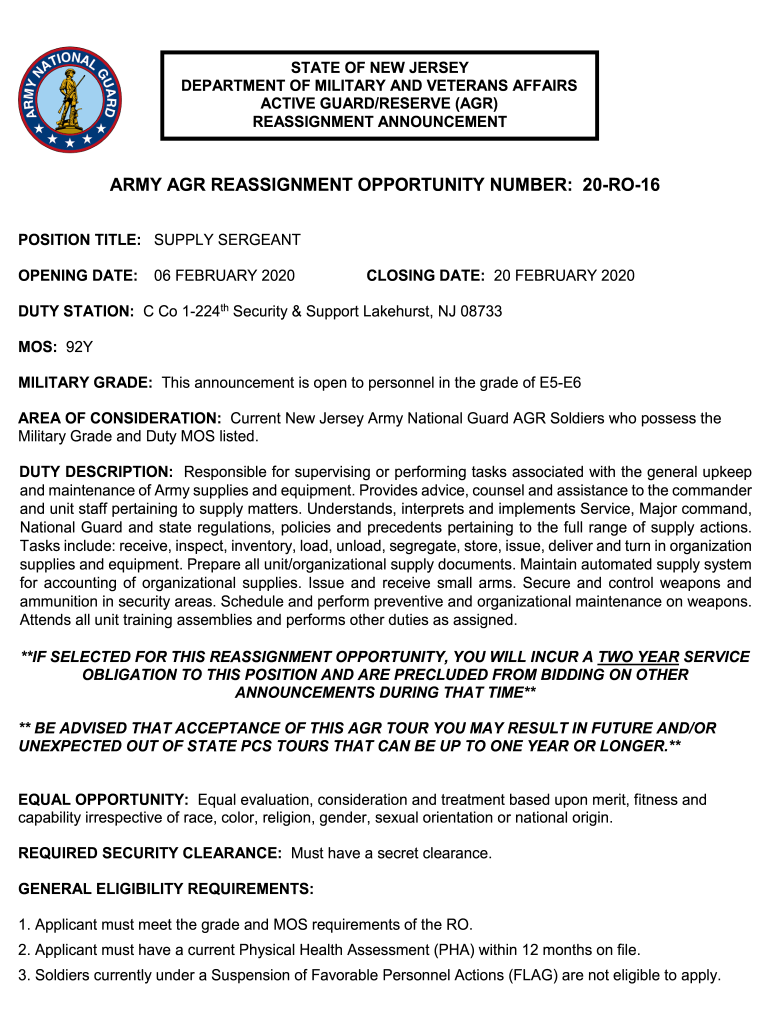 STATE OF NEW JERSEY DEPARTMENT OF MILITARY AND VETERANS AFFAIRS ACTIVE GUARD/RESERVE (AGR) REASSIGNMENT ANNOUNCEMENTARMY AGR REASSIGNMENT OPPORTUNITY NUMBER: 20RO16 POSITION TITLE: SUPPLY SERGEANT