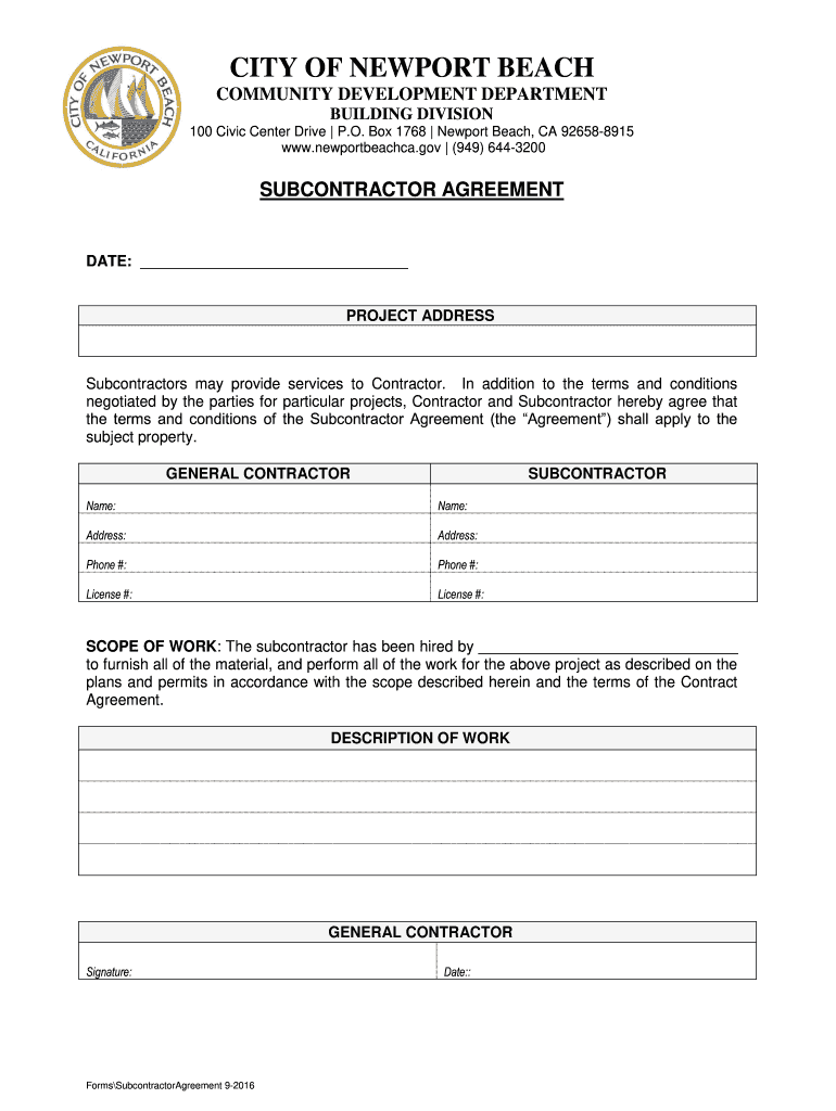 CITY OF NEWPORT BEACH COMMUNITY DEVELOPMENT DEPARTMENT BUILDING DIVISION 100 Civic Center Drive P.O. Box 1768 Newport Beach, CA 926588915 www.newportbeachca.gov (949) 6443200SUBCONTRACTOR AGREEMENTDATE:
