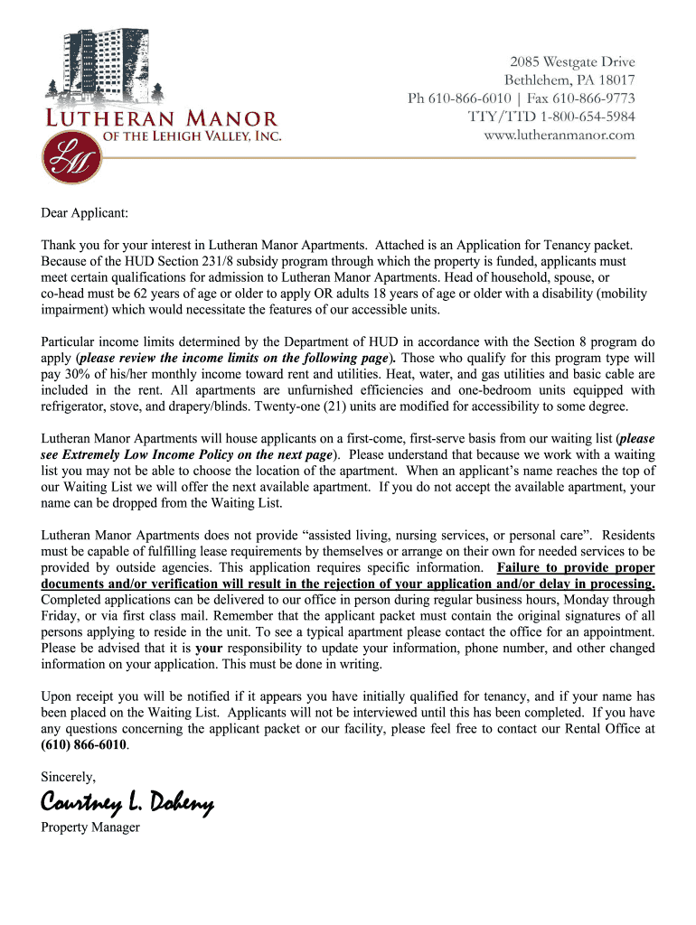 Thank you for your interest in Lutheran Manor Apartments. Attached is an Application for Tenancy packet.