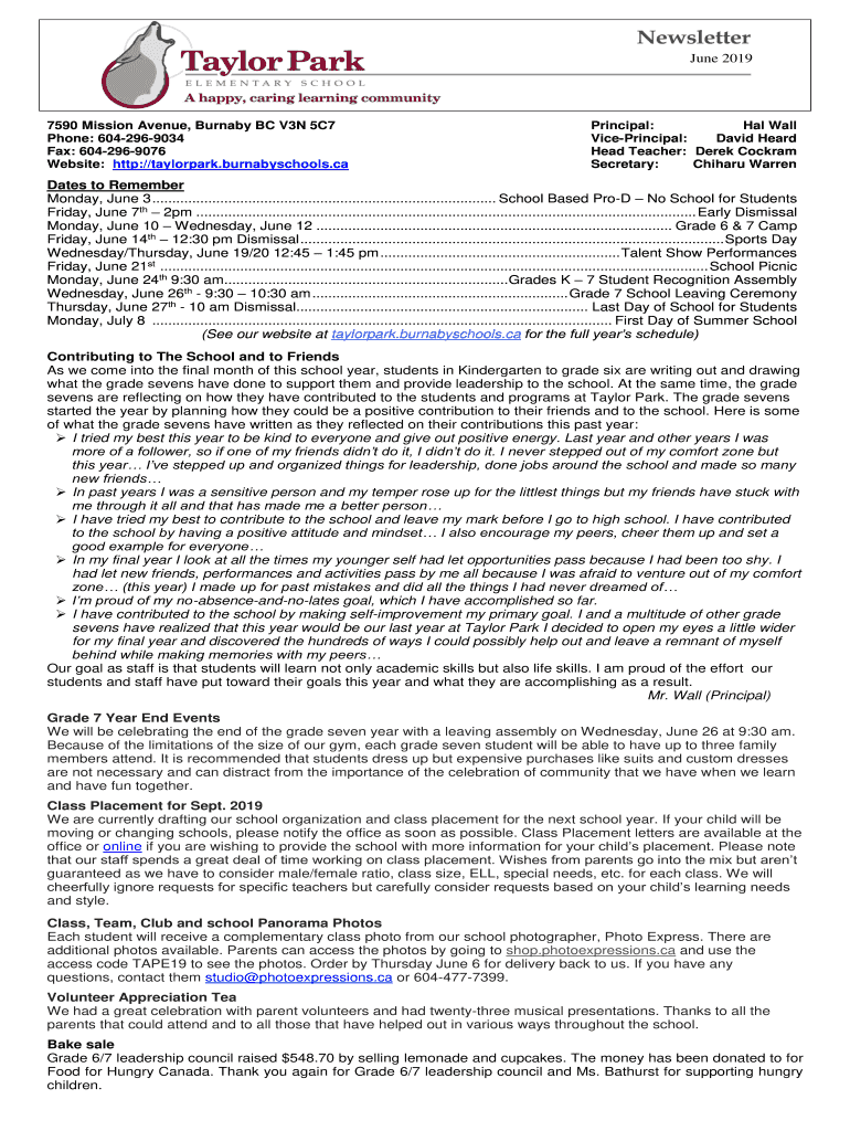 June 20197590 Mission Avenue, Burnaby BC V3N 5C7 Phone: 6042969034 Fax: 6042969076 Website: http://taylorpark.burnabyschools.caPrincipal: Hal Wall VicePrincipal: David Heard Head Teacher: Derek Cock