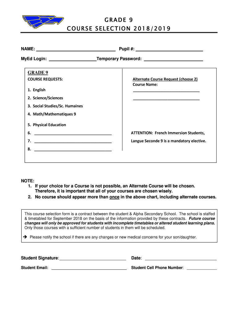 GRADE 9COURSE SELECTION 2018/2019NAME:Pupil #:Eyed Login: Temporary Password:GRADE 9 COURSE REQUESTS: 1. EnglishAlternate Course Request (choose 2) Course Name: 2. Science/Sciences 3. Social Studies/Sc.