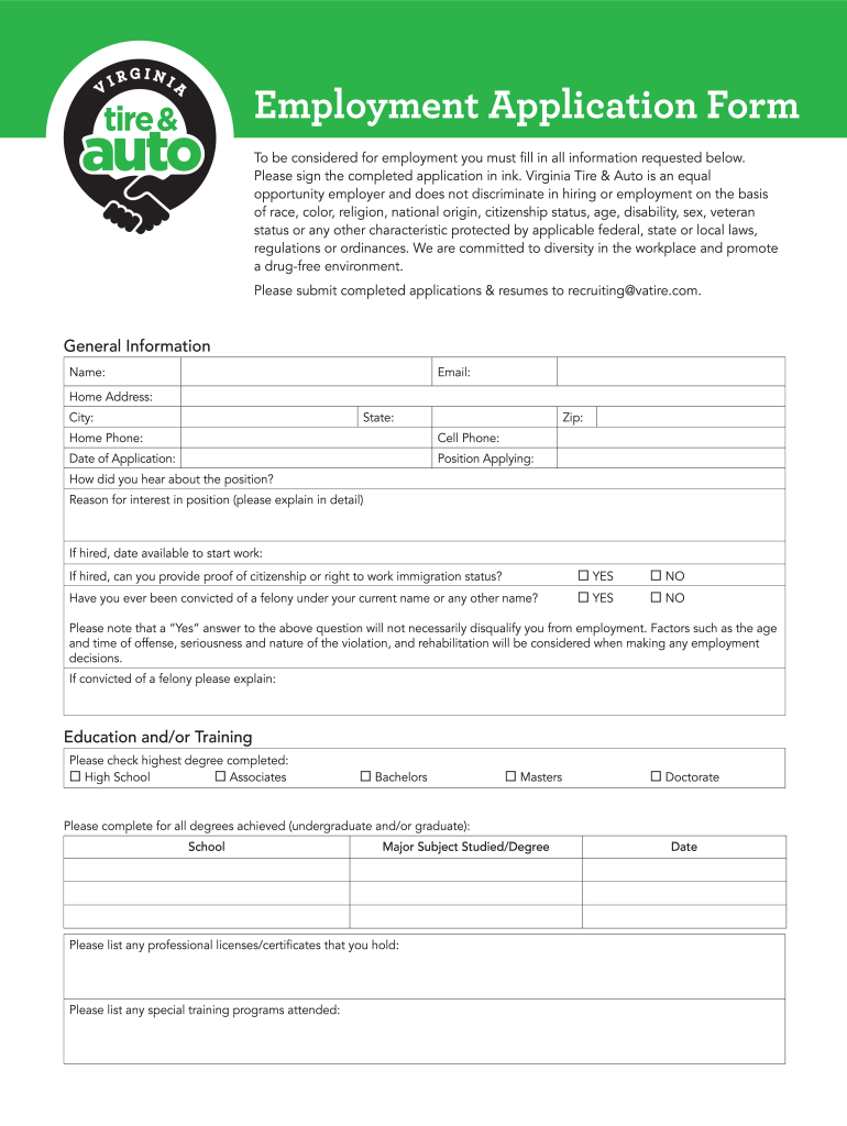 Employment Application Form To be considered for employment you must fill in all information requested below. Please sign the completed application in ink. Virginia Tire & Auto is an equal opportunity