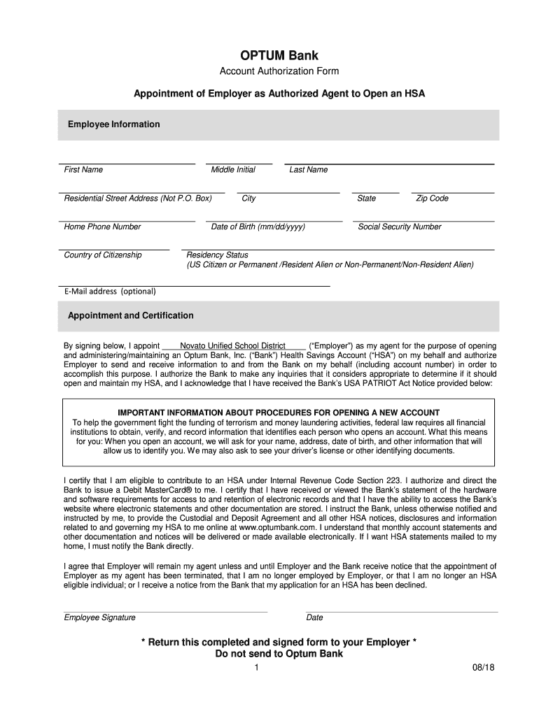 OPIUM Bank Account Authorization Form Appointment of Employer as Authorized Agent to Open an HSA Employee InformationFirst NameMiddle InitialResidential Street Address (Not P.O. Box)Home Phone NumberCountry