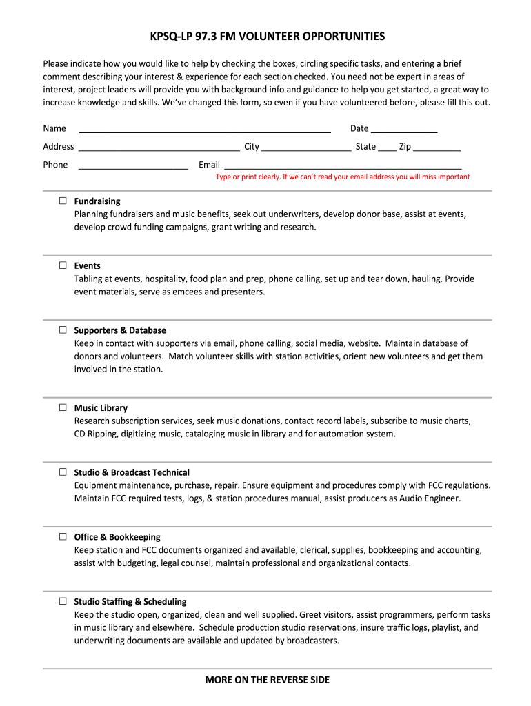SQL 97.3 FM VOLUNTEER OPPORTUNITIES Please indicate how you would like to help by checking the boxes, circling specific tasks, and entering a brief comment describing your interest & experience for