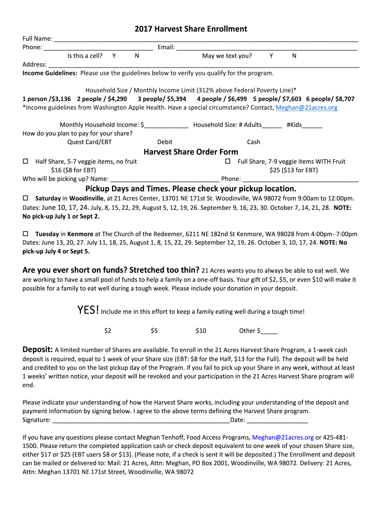 2017 Harvest Share EnrollmentFull Name: Phone: Email: Is this a cell? May we text you? Address: Income Guidelines:Please use the guidelines below to verify you qualify for the program. Household Size