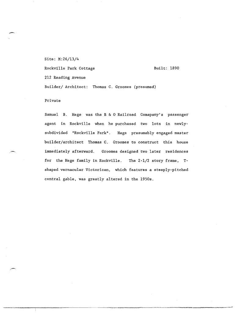Site: M: 26/13/4 Built: 1890Rockville Park Cottage 212 Reading Avenue Builder/ Architect:Thomas C. Grooves (presumed)Private Samuel agent. insubdividedHegewas the B & 0 RailroadRockvillehe purchased
