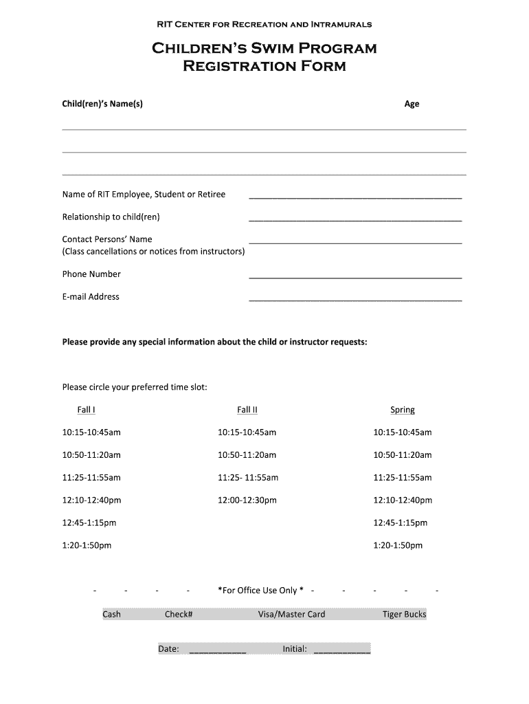 IT Center for Recreation and IntramuralsChildrens Swim Program Registration Form Child(men)name(s)AgeNameofRITEmployee, StudentorRetiree Relationshiptochild(men) ContactPersonsName (Classcancellationsornoticesfrominstructors)