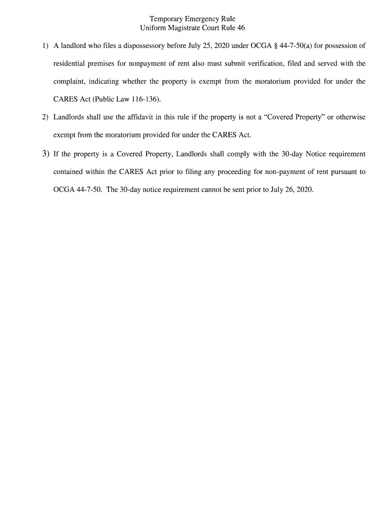 Temporary Emergency Rule Uniform Magistrate Court Rule 46 1) A landlord who files a dispossessed before July 25, 2020, under OLGA 44750(a) for possession of residential premises for nonpayment of