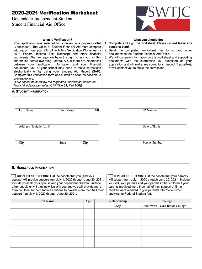 The verification worksheet for independent requires information such as household size, income, assets, and any other financial information that may impact the student's eligibility for financial aid.