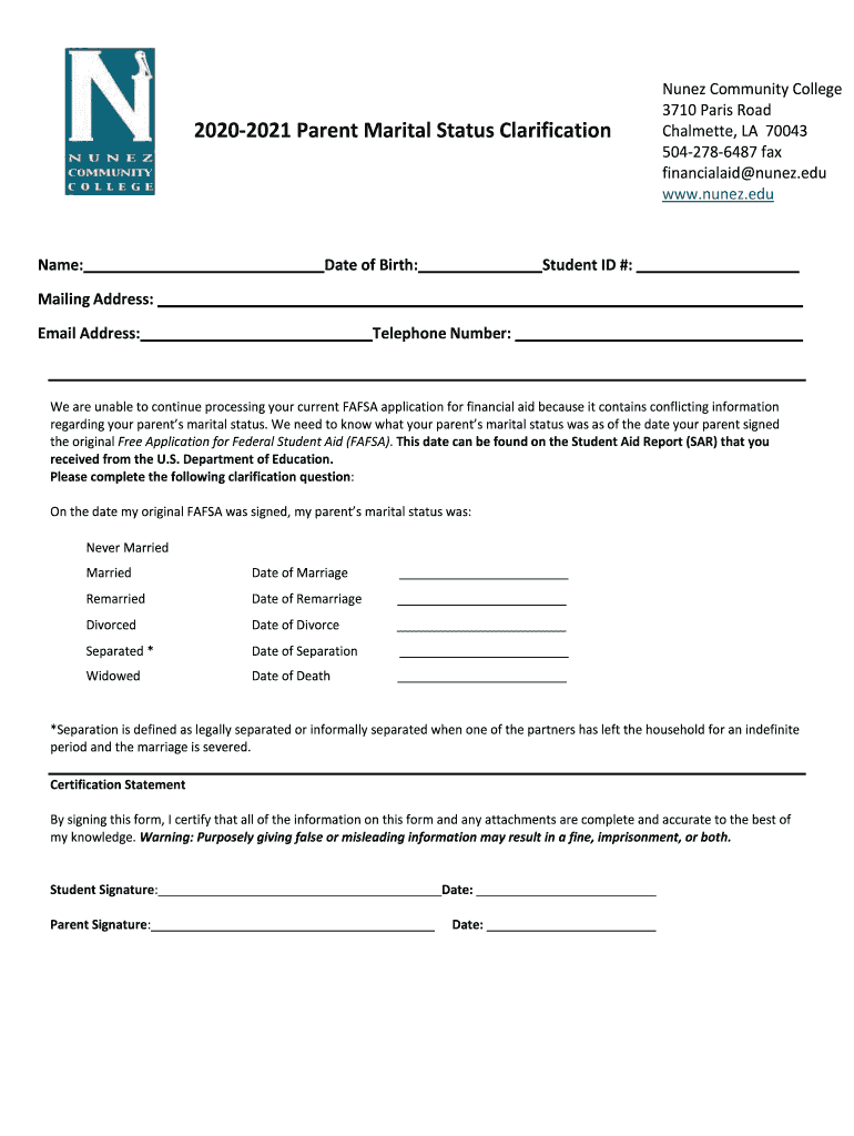 20202021 Parent Marital Status ClarificationName:Date of Birth:Nunez Community College