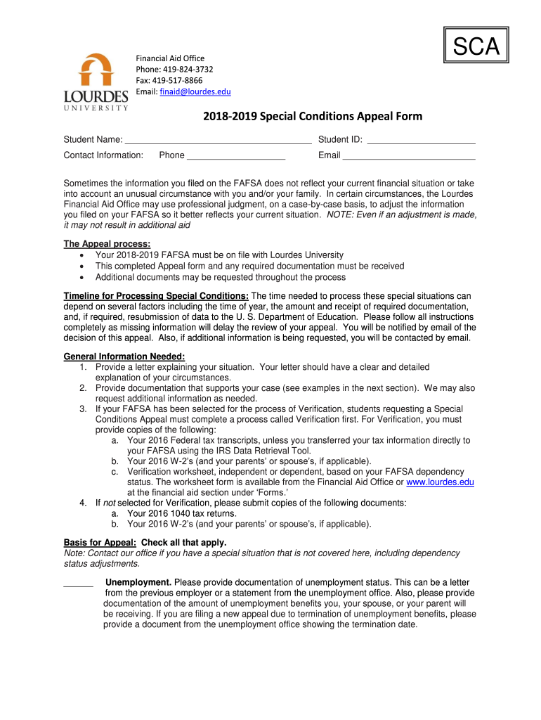 Financial Aid Office Phone: 4198243732 Fax: 4195178866 Email: fin aid Lourdes.edu20182019 Special Conditions Appeal Form Student Name: Student ID: Contact Information:Phone Sometimes Email the information