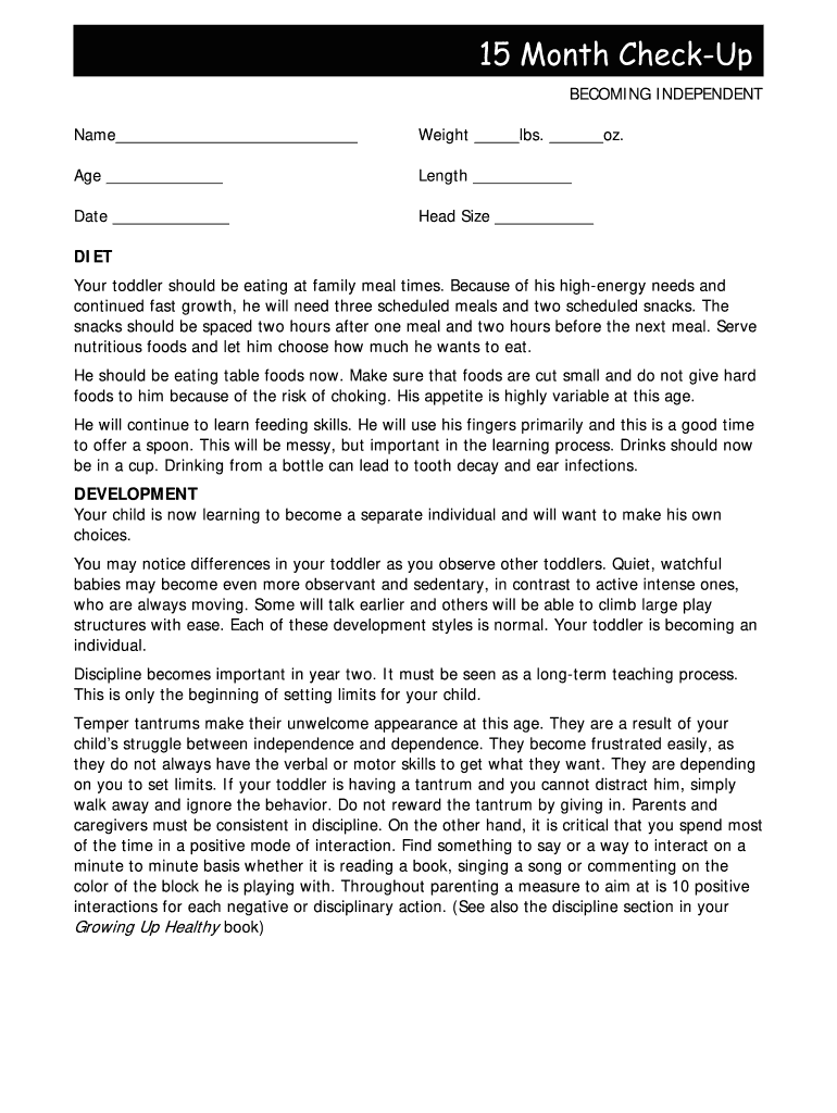 15 Months CheckUp BECOMING INDEPENDENT Name Weight lbs. oz. Age Length Date Head Size DIET Your toddler should be eating at family meal times. Because of his high energy needs and continued fast growth,