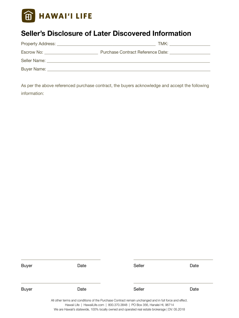 Sellers Disclosure of Later Discovered Information Property Address: MK: Escrow No: Purchase Contract Reference Date: Seller Name: Buyer Name: As per the above referenced purchase contract, the buyers