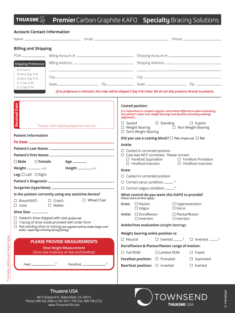 Premier Carbon Graphite KAFOSpecialty Bracing Solutions Account Contact Information Name:Email:Phone:Billing and Shipping PO# Shipping PreferenceReceived Date Ground Next Day A.M. Next Day P.M. 2Day