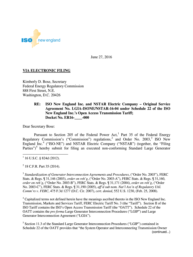 June 27, 2016VIA ELECTRONIC FILING Kimberly D. Bose, Secretary Federal Energy Regulatory Commission 888 First Street, N.E. Washington, D.C. 20426 RE:ISO New England Inc. and STAR Electric Company