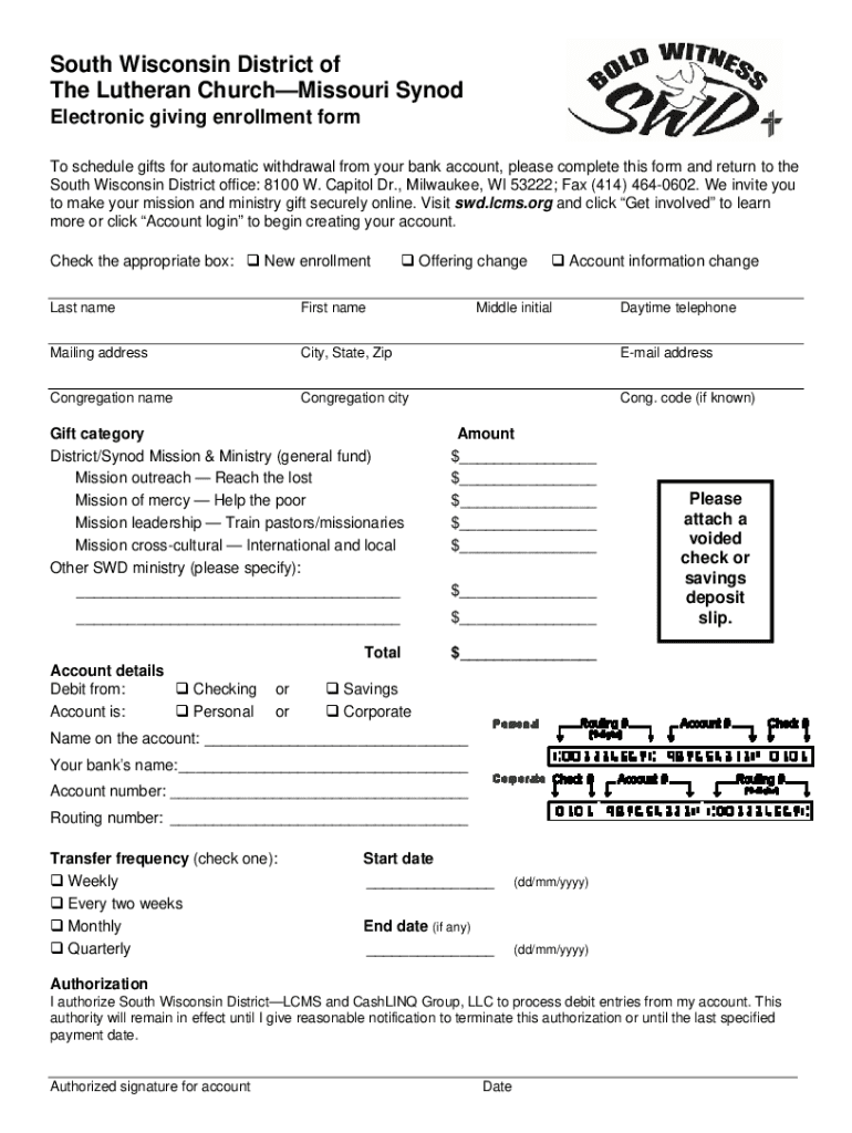 Anyone wishing to make electronic donations to the South Wisconsin District of The Lutheran Church—Missouri Synod can use this form. It is primarily for donors wanting to set up automatic withdrawals from their bank accounts.