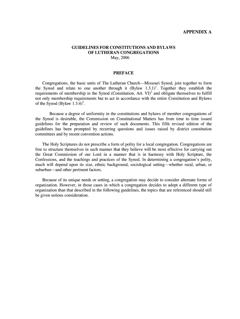 APPENDIX A GUIDELINES FOR CONSTITUTIONS AND BYLAWS OF LUTHERAN CONGREGATIONS May 2006 PREFACE Congregations, the basic units of The Lutheran Church Missouri Synod, join together to form the Synod
