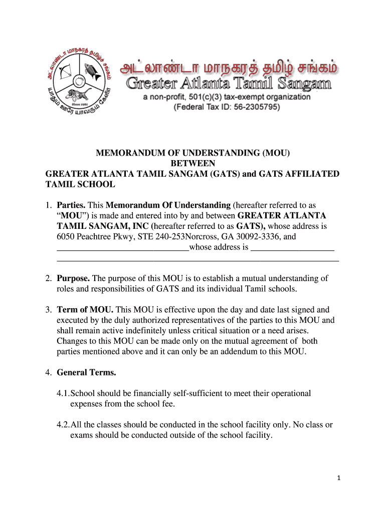 MEMORANDUM OF UNDERSTANDING (YOU) BETWEEN GREATER ATLANTA TAMIL SAN GAM (GAS) and GAS AFFILIATED TAMIL SCHOOL 1. Parties. This Memorandum Of Understanding (hereafter referred to as YOU) is made and