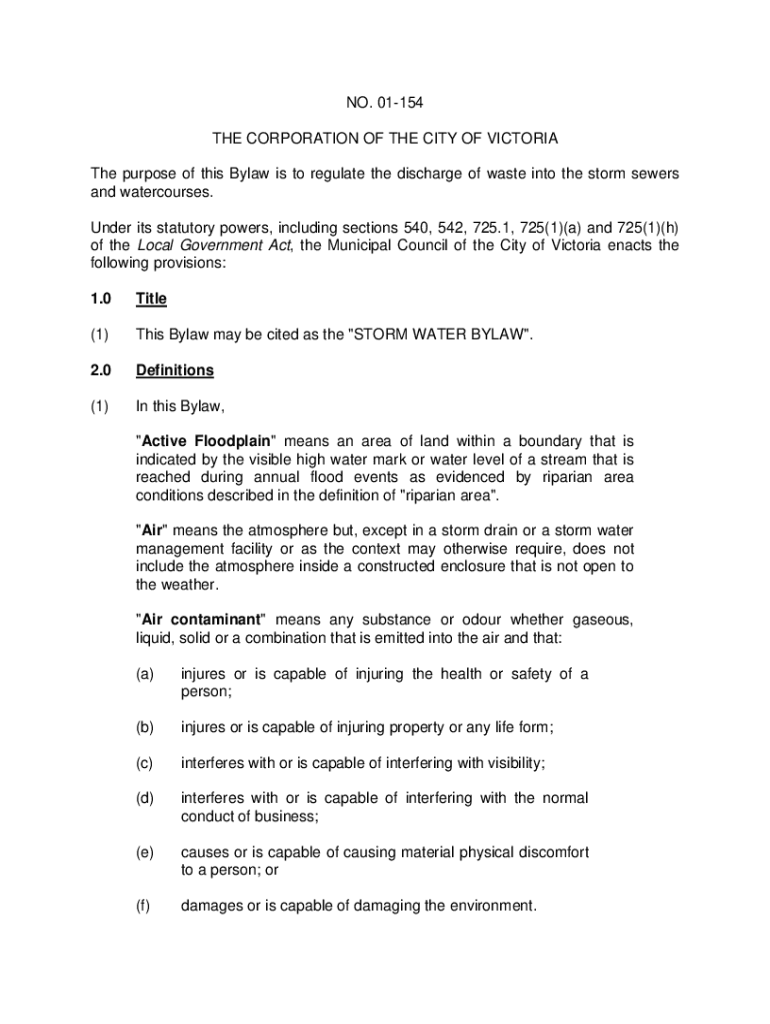 NO. 01154 THE CORPORATION OF THE CITY OF VICTORIA The purpose of this Bylaw is to regulate the discharge of waste into the storm sewers and watercourses. Under its statutory powers, including sections